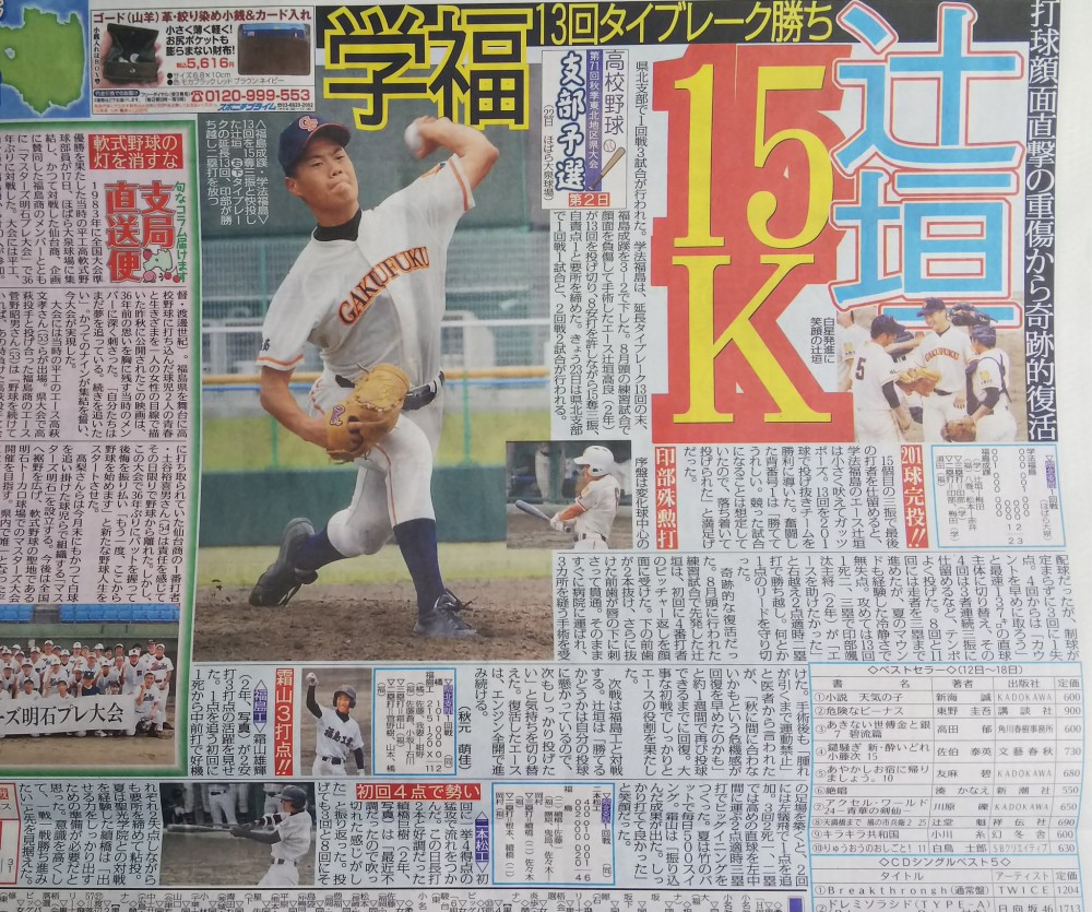 ・・・ 201球完投!! 15個目の三振で最後の打者を仕留めると、学法福島の辻垣は小さく吠えて ガッツポーズ。13回を201球で投げ抜きチームを勝利に導いた。 奮闘した背番号1は「勝ててうれしい。競った試合になることは想定して いたので、落ち着いて投げられた」と満足げだった。 ・・・ ![]() |