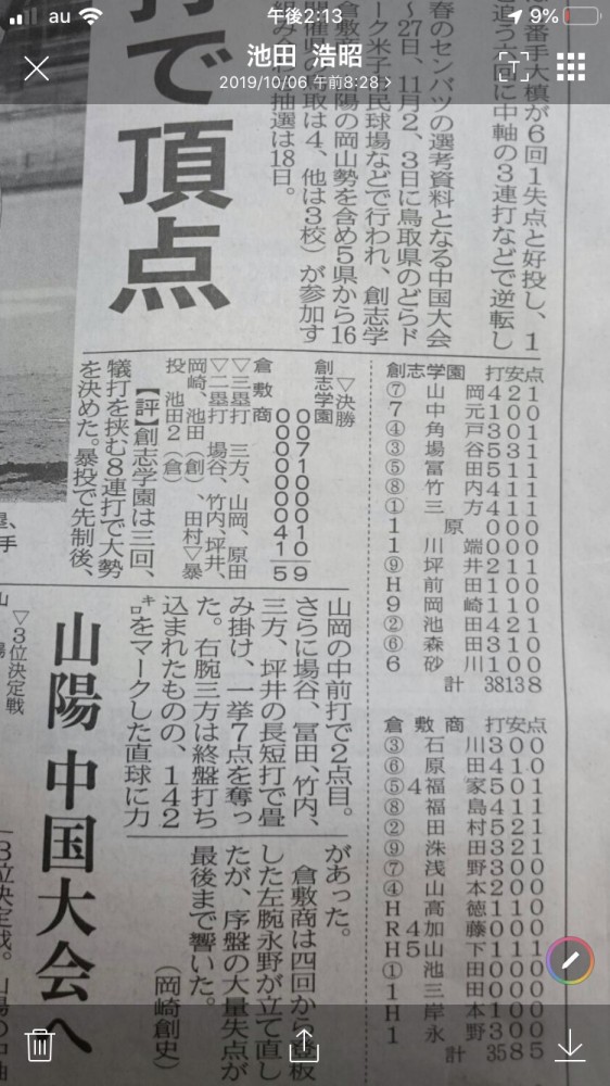 ・・・ 決勝は創志学園が9-5で倉敷商を下し、6年ぶり2度目の頂点に立った。 ・・・ 2死となっても角戸が送り、中軸の場谷、冨田、竹内が3連打で先発をノックアウト。 2番手にも三方と1年坪井が連続長打を浴びせ、早々と勝負を決めた。 ・・・ http://nm.sanyo.oni.co.jp/sp/2019/10/post-136879.php |